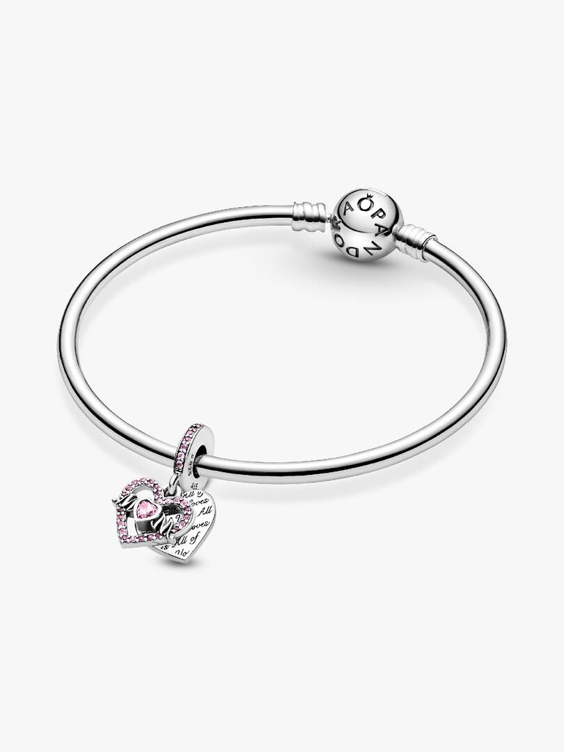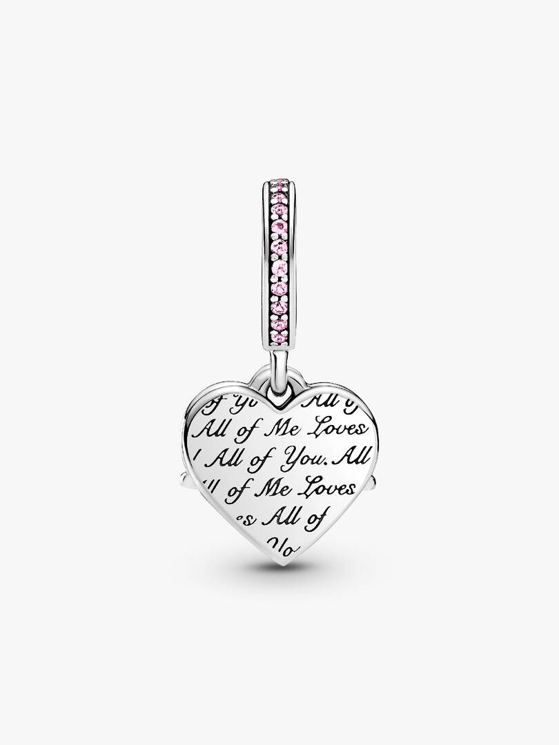 Surprise her with the Heart & Mom Dangle Charm. Hand-finished in sterling silver, the heart-shaped front disc is outlined with pink crystals and features ??Mom?? script with the ??U?? replaced by a heart set with a matching ,stone. The engraving ??All of me loves all of you?? features on the back heart-shaped disc in a repeating pattern. A row of pink sparkling stones features on the bail. Put a smile on your mom’s face with this colorful design.