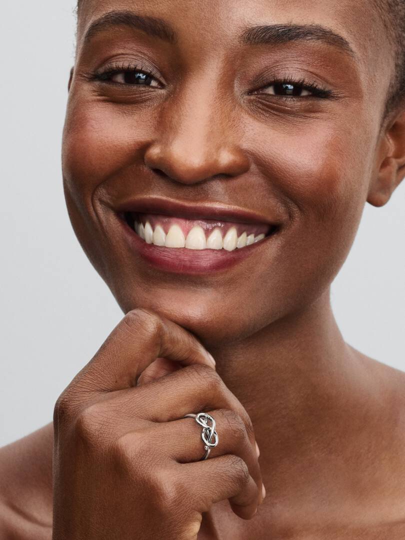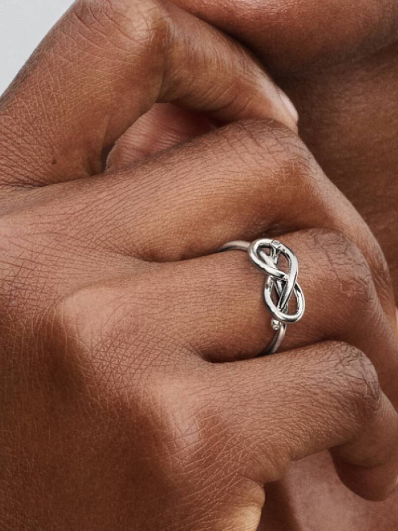 Bring a symbol of the infinite into the everyday with the Infinity Knot Ring. Hand-finished in sterling silver, this ring centers on an infinity knot symbol featuring a sparkling stone at each end. Sleek and delicate, th,is ring easily goes from casual daytime wear to bold evening looks ?C bringing with it all its symbolism of eternal love and the interconnectedness of all beings. A simple piece with endless potential.