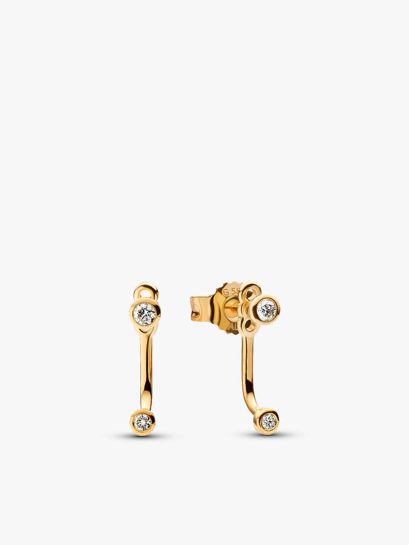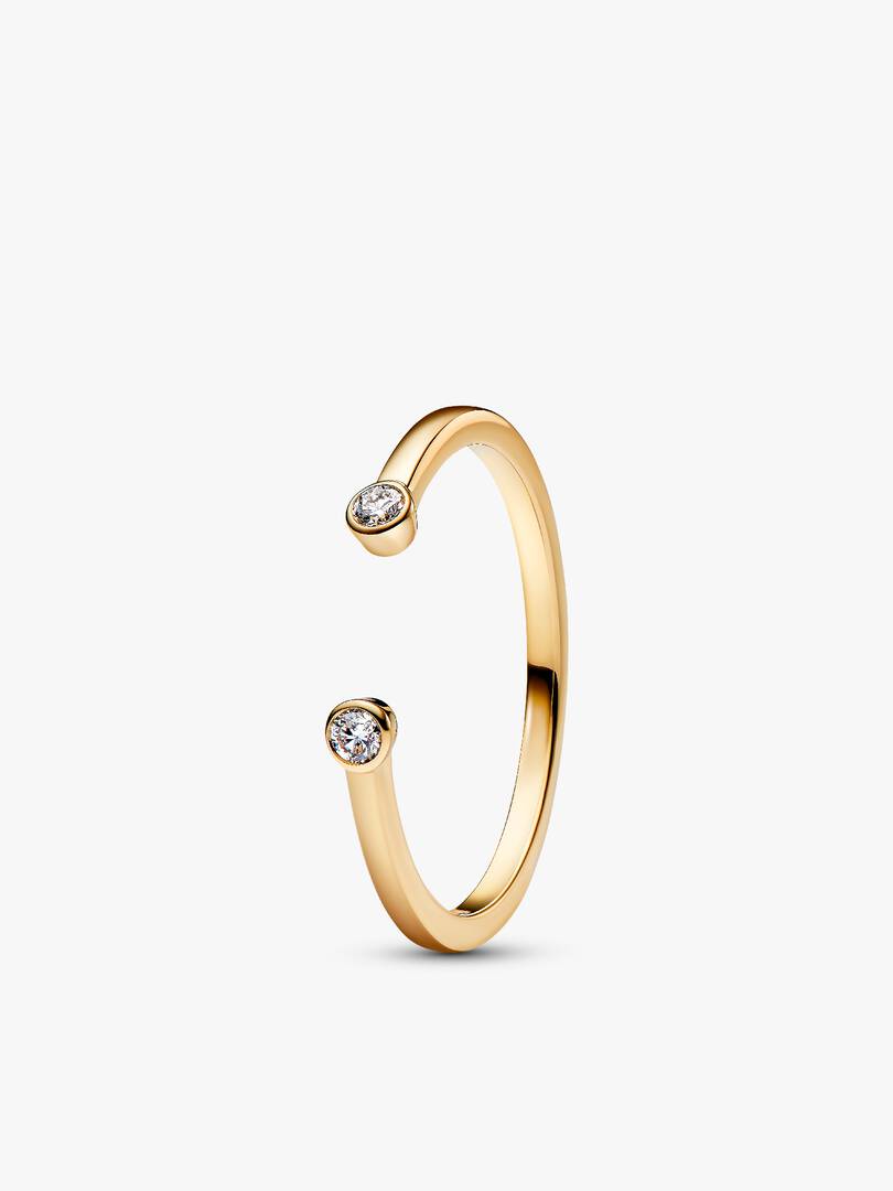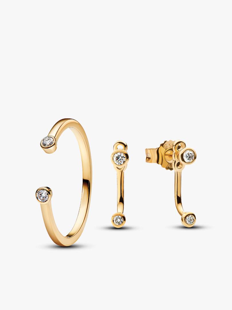 The Lab-Grown Diamond Open Earring and Ring Set combines innovation with elegance. The earrings feature adjustable earring jackets with two bezel-set lab-grown diamonds (0.10ct TW), one on the stud and one at the end of ,the jacket. Choose your preferred length from three options to customize your look. The stacking ring is crafted from solid 14k gold, featuring two bezel-set lab-grown diamonds on each end of the open band. With a minimalist aesthetic, it’s perfect for layering with other Pandora Era rings. This set brings together timeless beauty and modern design for a chic, personalized touch.