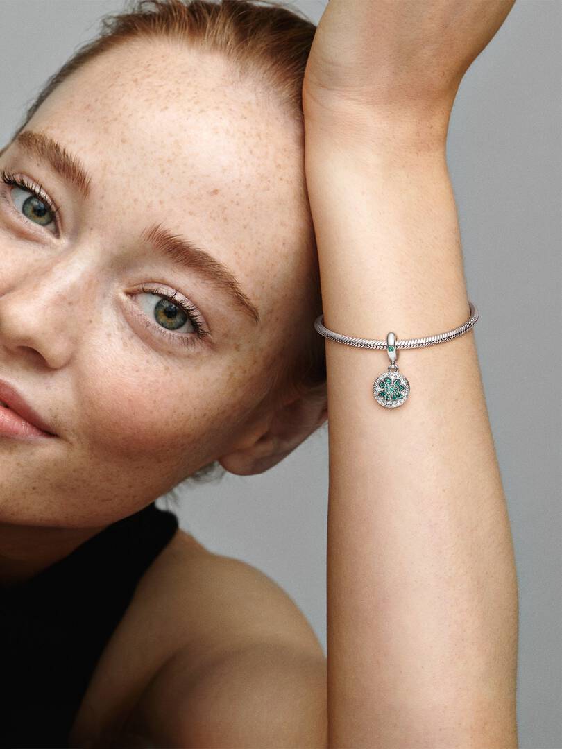 Feel lucky every day with this shimmering good luck charm. Set with clear cubic zirconia and green crystals, it brings meaning to your look and luck to your life. The sterling silver dangle charm is centered with a four-,leaf clover. Wear it on your Pandora Moments bracelet as a symbol of your story or gift it to someone special as a lucky charm.