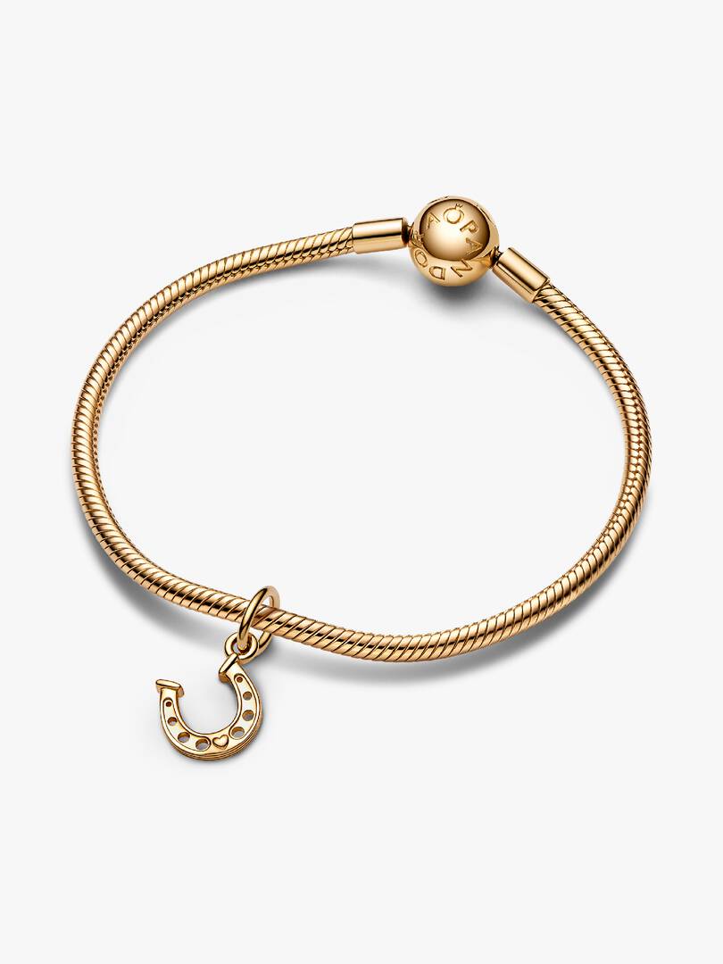 A symbol of love and luck for you or your nearest and dearest. The Lucky Horseshoe Dangle Charm is crafted in solid 14k gold for an elevated take on a classic symbol. The horseshoe is attached to the bail from one end an,d features a row of cut-out circles and a raised heart at the center on both sides.