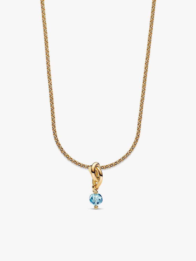 For the month of March, sea aqua blue. Inspired by the positive power each color brings, our Eternity Circle dangle charm gets a glow up in 14k gold-plating with a new faceted stone cut design and intricate triple knotte,