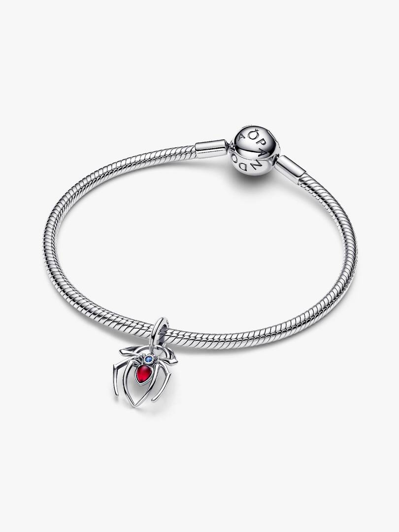 Swing into style with the sterling silver Marvel Spiderman Dangle Charm. Featuring blue and fuchsia man-made crystals, its openwork design captures resilience and strength. Perfect for adding a pop to your collection.