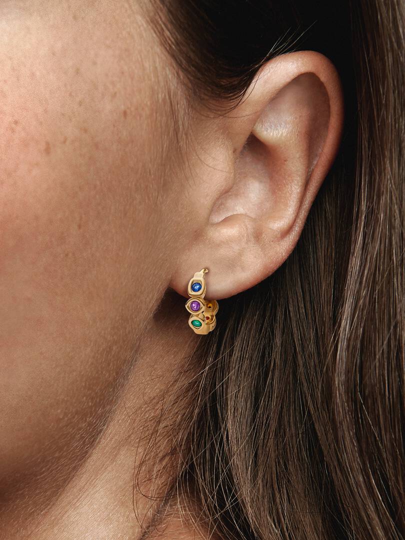 Power up your look with our Marvel Infinity Stones Hoop Earrings. Representing the most coveted objects in the universe, these 14k gold-plated earrings feature six colourful man-made crystals set in alternating marquise,, circle and square shapes. The side of each shape is engraved with its stone’s corresponding symbolic power: “SPACE”, “POWER”, “TIME”, “REALITY”, “SOUL” and “MIND”. Style them the same direction for a perfectly balanced look, or switch them to show every colour of the rainbow.