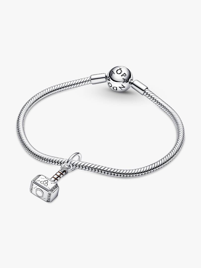 Bring the thunder with our Marvel The Avengers Thor’s Hammer Dangle Charm and share your love for the Marvel Cinematic Universe with the world. Hand-finished in sterling silver, Thor’s hammer is brought to life with swir,ling brown enamel, engraved scratch marks and Asgardian-style rune symbols. The side of the hammer is engraved with ??Worthy?? as a reminder of the source of Thor??s power. Add this charm and more of your favorite heroes to our Pandora Moments Marvel The Avengers Logo Clasp Snake Chain Bracelet.
