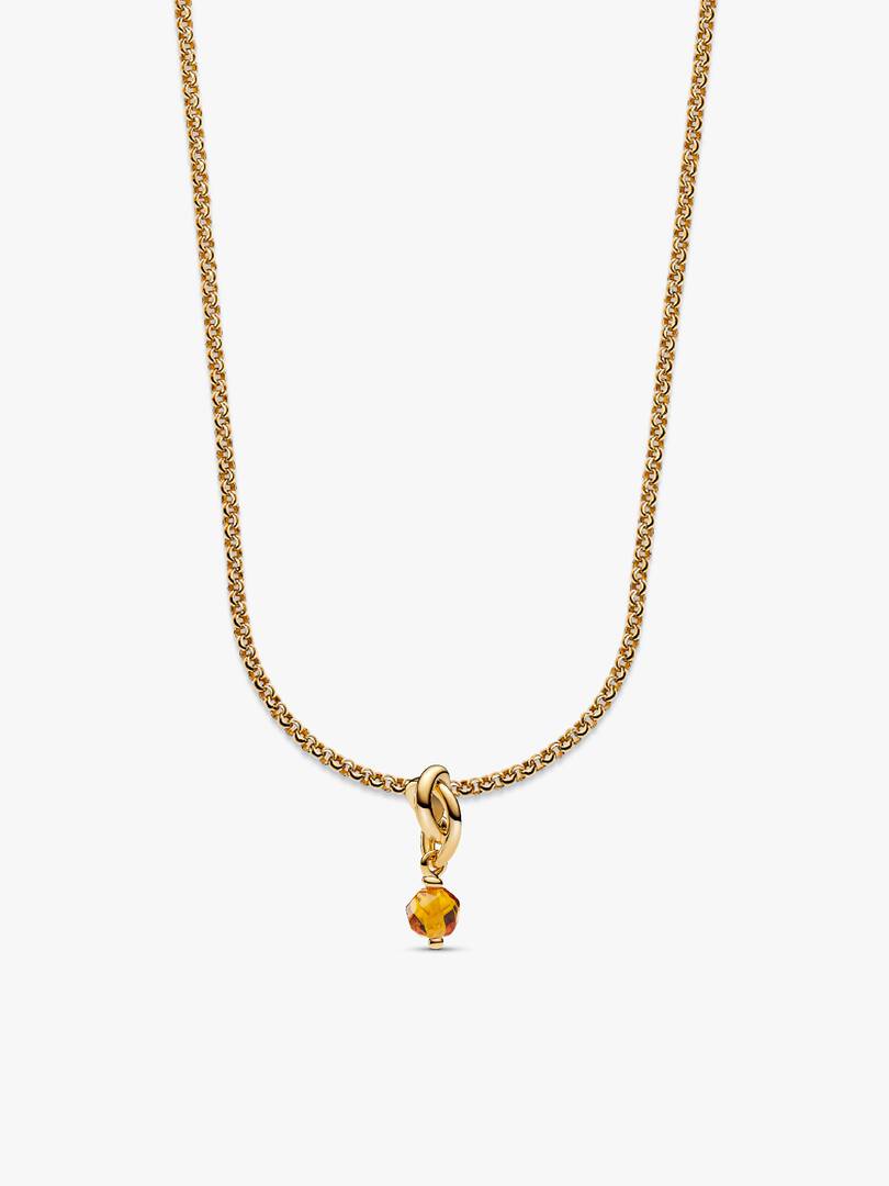 For the month of November, a honey hue. Inspired by the positive power each colour brings, our Eternity Circle dangle charm gets a glow up in 14k gold-plating with a new faceted stone cut design and intricate triple knot,