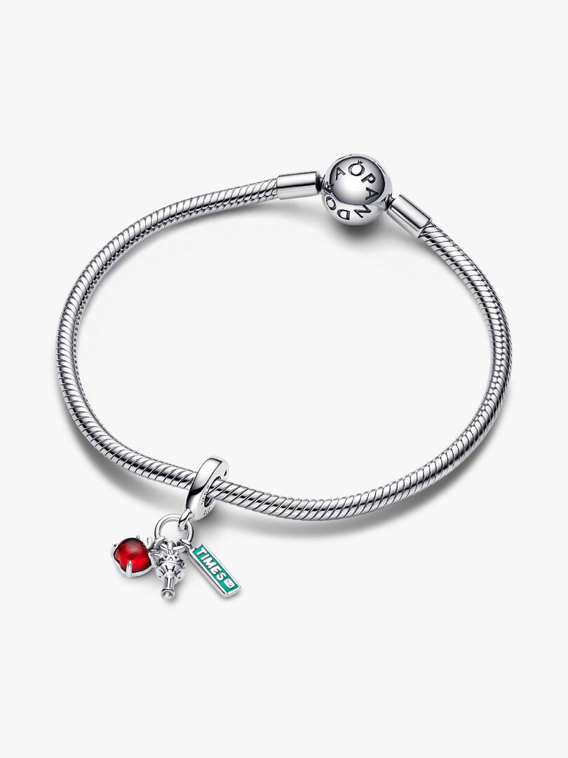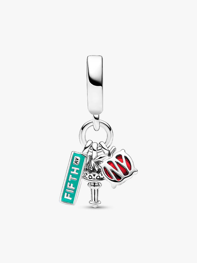 Mark your favorite memories with the NYC Apple, Torch and Street Sign Triple Dangle Charm. Carry the unmistakable atmosphere of the Big Apple with you with this sterling silver dangle charm featuring symbols of New York ,City. Combining a red Murano glass apple, the Statue of Liberty’s famous torch and the famous Fifth Av. street sign design in blue green enamel, this Pandora dangle charm symbolizes the endless dreams the city holds. Bring home a small piece of the big city for yourself or someone close to your heart.