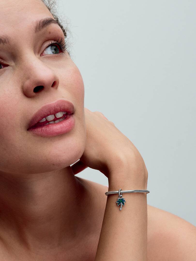 Bring an easy-breezy touch to your look with the Opalescent Green Palm Tree Dangle Charm. This sterling silver charm shaped like a palm tree features a lab-created opal with a glitter-streaked spectrum of green and blue ,hues on one side. On the other side, a raised heart is centered within a cut-out frame. The palm tree’s curved base is punctuated with sparkling stones. Accessorize any look with this tropical-inspired charm for a dose of feel-good island energy anywhere, anytime.