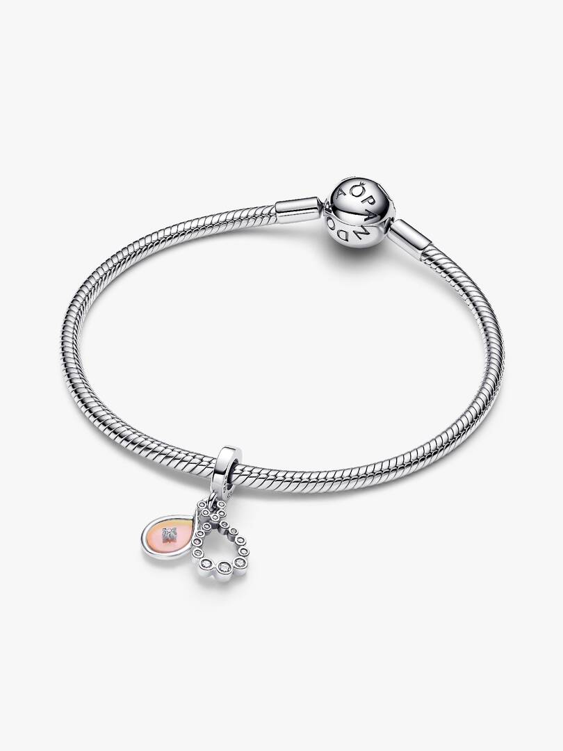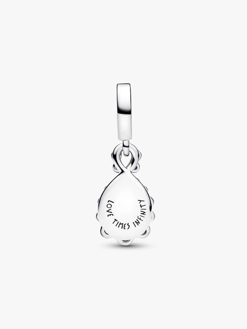 This sterling silver double dangle sparkles with clear cubic zirconia on one charm and aurora lab-grown opal resin on the other. Engraved with ‘LOVE TIMES INFINITY’, wear it as a reminder of everlasting connections.