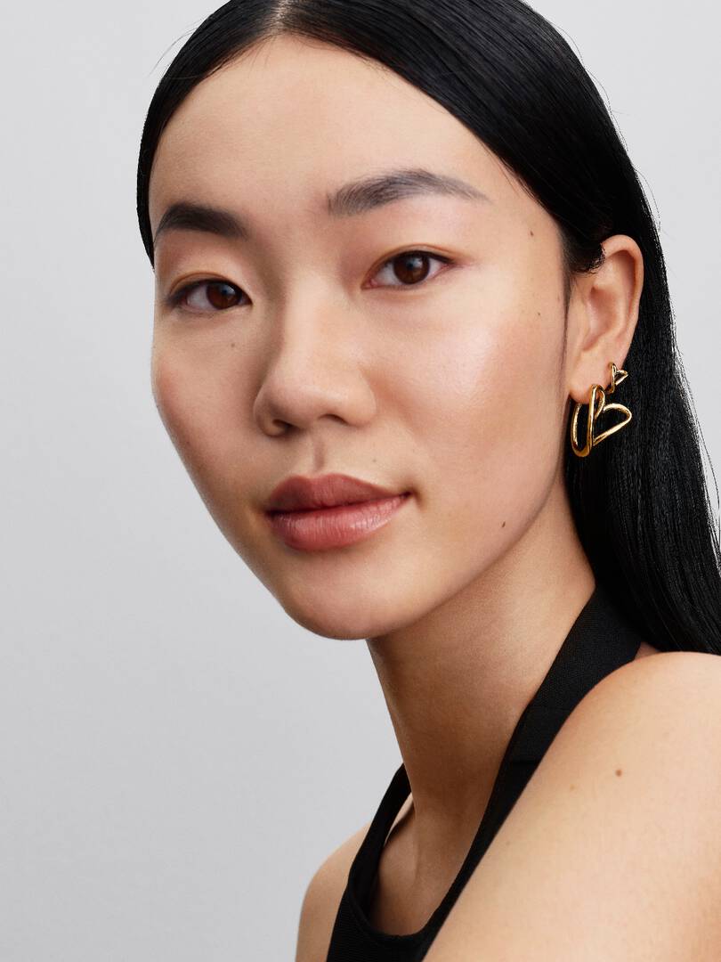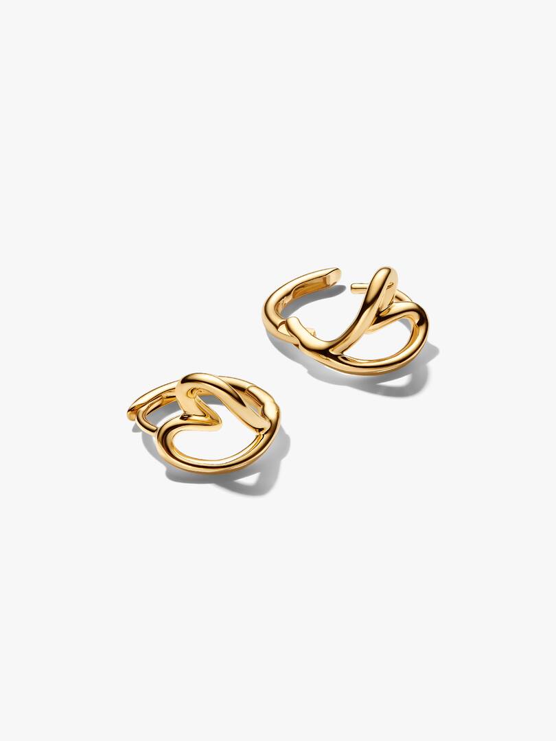 Love is in your nature. These 14k gold-plated hoop earrings feature abstract openwork hearts. They have a click closure and are sold as a pair, mirroring each other. Size down to make a more subtle statement.