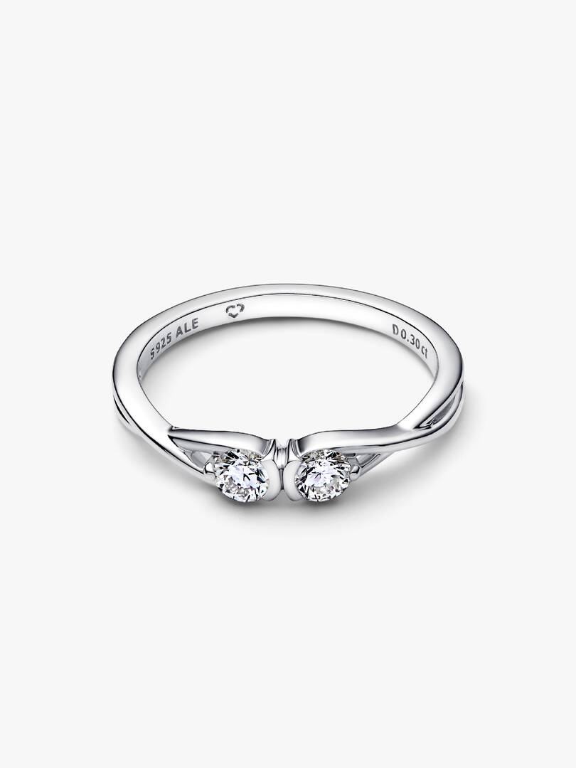 Discover the diamond for every side of you. Our Pandora Infinite Sterling Silver Double Facing Lab-grown Diamond Ring reflects twice the amount of light and sparkle with two round brilliant excellent cut lab-grown diamon,ds, totaling 0.30 carat, in a modern infinity shape. Hand-set in sterling silver, each lab-grown diamond rests inside an infinity loop, appearing to float weightlessly with the support of a prong-and-partial-bezel setting. Inspired by infinite connections, the unique infinity design flows seamlessly around the stones and represents your eternal bonds. Each Pandora Lab-grown diamond is treated with a post-growth color enhancement called annealing.