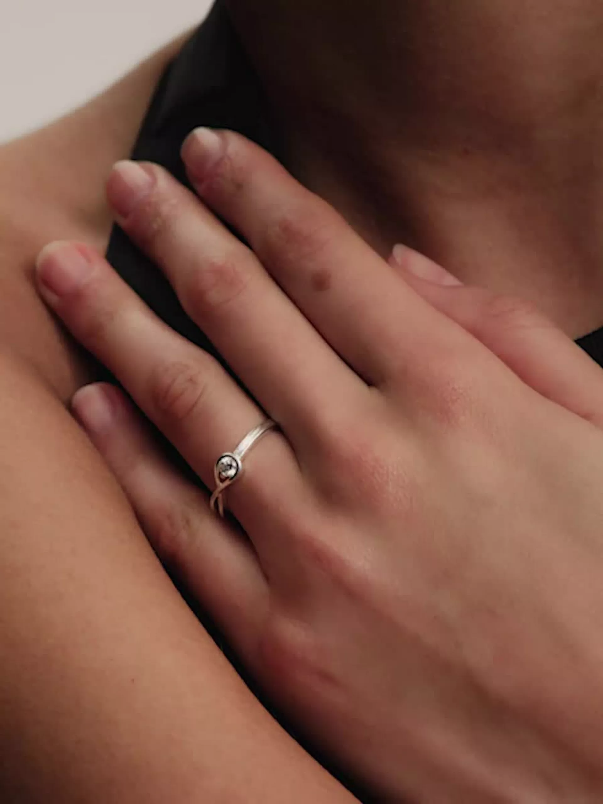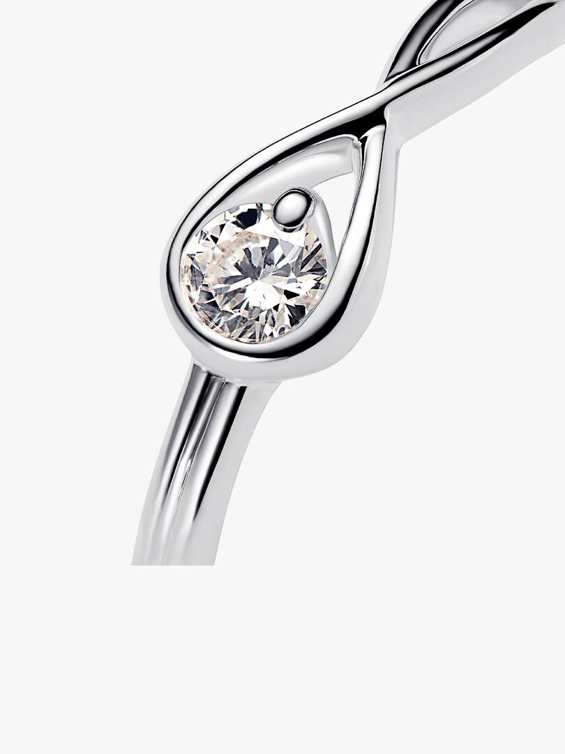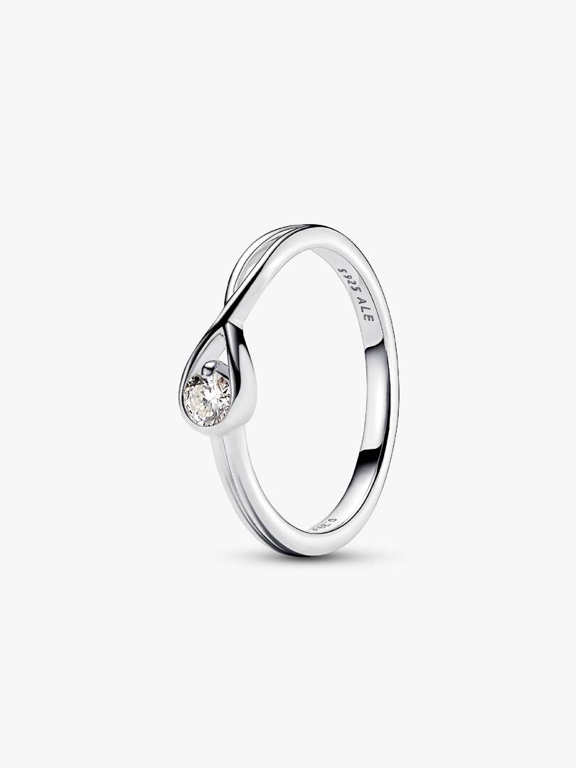 A solid sterling silver ring hand set with a 0.15 carat lab-grown diamond. A beautiful statement of empowerment and possibility, or a simple yet eloquent declaration of love. This ring features a scintillating round bril,liant excellent cut lab-grown diamond in a modern infinity setting that flows seamlessly around the stone. It can be worn alone or stacked with other rings from the Pandora Infinite collection. Each Pandora Lab-grown diamond is treated with a post-growth color enhancement called annealing.
