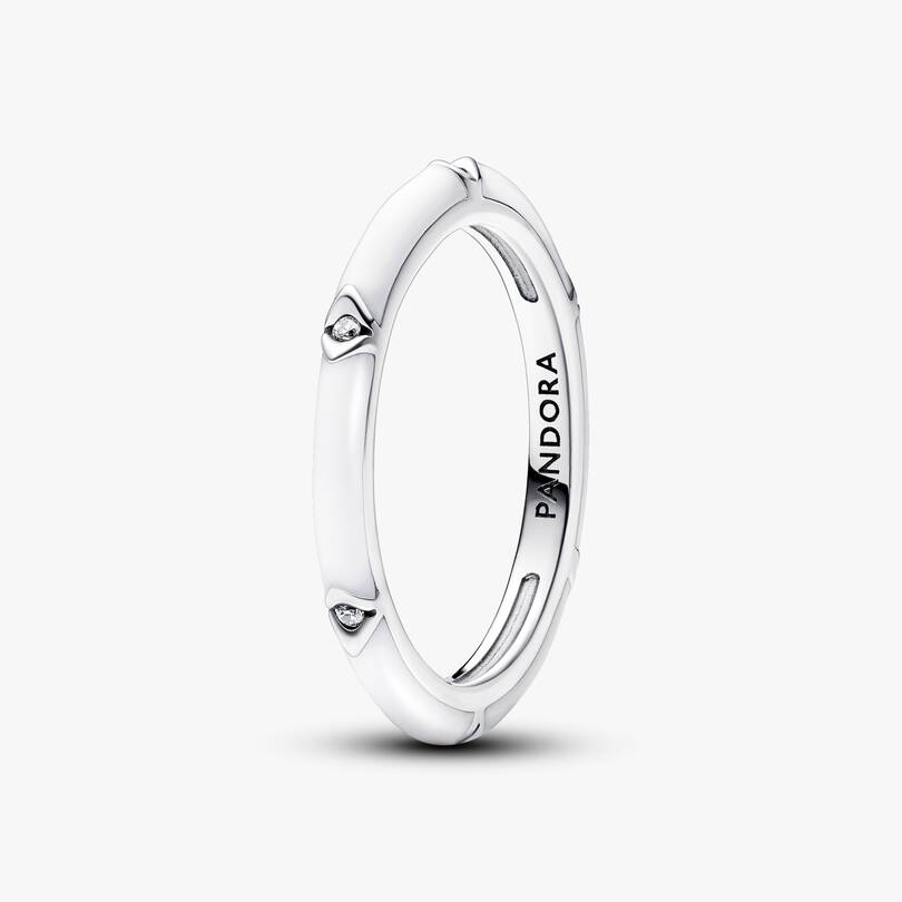 Add impact to your ring styling with the Pandora ME Enamel Ring Set. This set includes two sterling silver rings with contrasting enamel colors: one featuring shiny white enamel punctuated by reverse pyramid-shaped inden,ts set with sparkling stones, and another with a black heart-shaped stone at the centre, complemented by black enamel on the halo and band. Pair them with your other Pandora ME rings in different textures and enamel colors to create your own custom stack.
