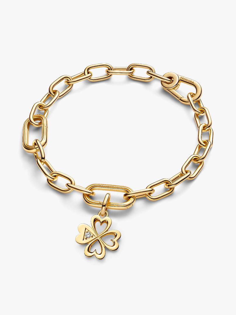Get lucky with the Pandora ME Heart Four-leaf Clover Medallion Charm. With four heart-shaped leaves, this 14k gold-plated clover medallion charm has two distinctly different sides. One side is polished with three cut-out, hearts and one solid heart set with a sparkling stone inside an triangle detail; the other side is covered in a microbead pattern on all four leaves. This clover medallion charm will bring a golden glow to your look while reminding you that you make your own luck. Compatible with Pandora ME and Pandora Moments.