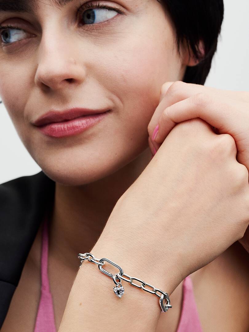 Find your match with the Pandora ME Keyhole Heart Mini Dangle Charm. This sterling silver charm features a heart-shaped clear cubic zirconia stone with a keyhole motif in black enamel, inspired by the symbolism of tattoo, art. Behind the stone is a heart-shaped cut-out to let the light shine through. Pair it with the Pandora ME Key Mini Dangle Charm to symbolise those relationships that just “click”, or wear one yourself and gift one to the person who’s a perfect match. This mini dangle charm can be styled on Pandora Moments charm holders and openable links on Pandora ME carriers.