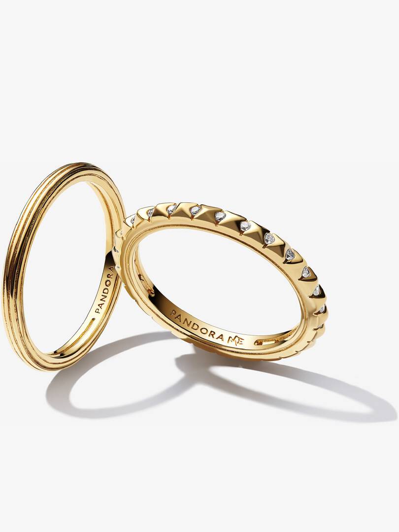 Stud and stack your style with the Pandora ME Pyramids Ring Set. Pairing two essential 14k gold-plated rings in one must-have combination, this set features one pyramid-studded eternity band with sparkling stones and one, statement stacking ring with grooved edges. The stacking ring can be styled with mini dangle charms through a Pandora ME openable link, allowing you to further up the ante on your unique stacking style and one-of-a-kind look.