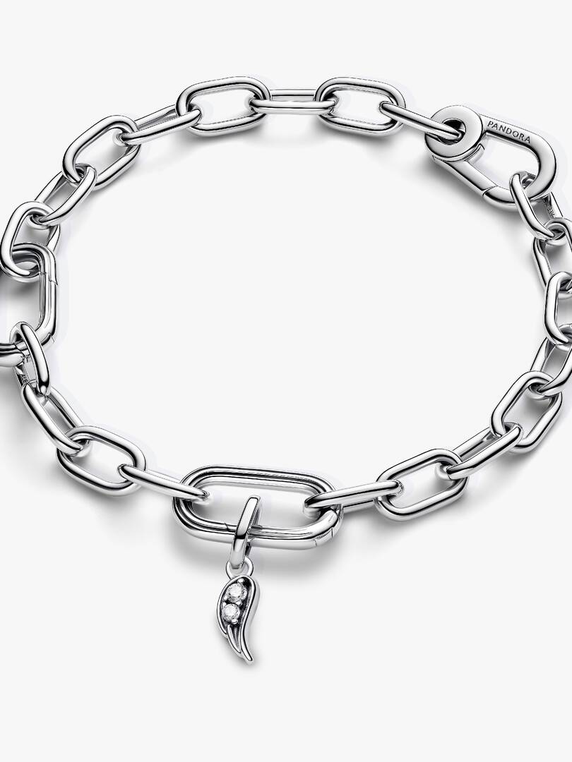 Let your spirits soar when you wear the Pandora ME Sparkling Angel Wing Mini Dangle Charm. One side of this sterling silver mini dangle charm boasts sparkling stones and raised line detailing, while the reverse features ,two curved rows of microbeading. The rich texture on each side contrasts prettily with the polished sides of the wings and the link-shaped bail. This angel wing mini dangle charm will bring an ethereal touch to your look and remind you to let your dreams take flight. Compatible with Pandora ME and Pandora Moments.
