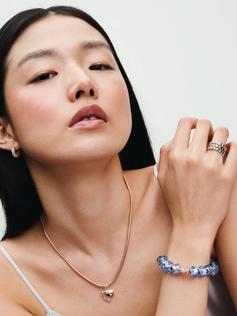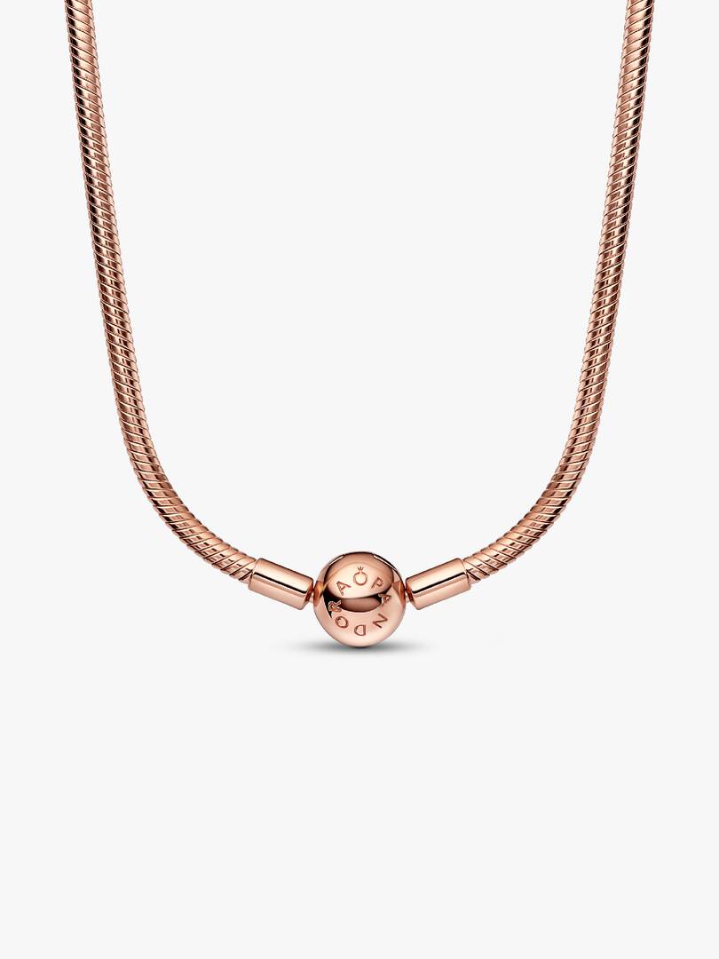 Say hello to your new jewelry box staple with the Pandora Moments Snake Chain Necklace. Hand-finished with 14k rose gold plating, this simple yet elegant design features Pandora??s iconic snake chain pattern and a ball cl,asp embossed with the Pandora logo. Wear it on its own or style with a Pandora O Pendant and keep your favorite charms close to your heart.
