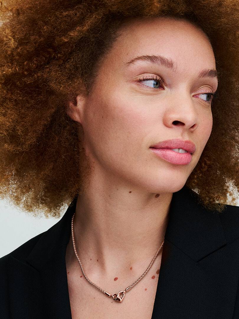 Update your jewelry collection with the Pandora Moments Studded Chain Necklace in our 14k rose gold-plated unique metal blend. This hand-finished necklace features a flexible, textured chain and an infinity-detailed hear,t clasp with an interior infinity symbol. This studded chain necklace can be styled with any size of the Pandora Moments O Pendant or Heart Charm Pendant. Please note the clasp cannot be styled with charms.