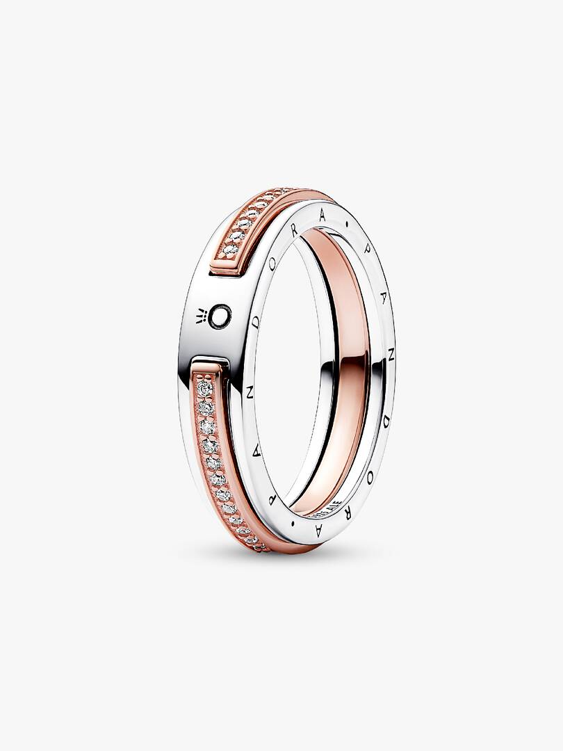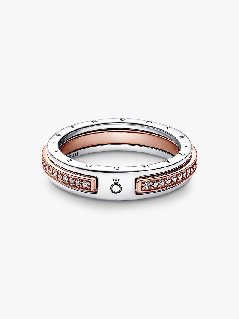 Build your ring stack with the Pandora Signature Two-tone Logo & Pav?? Ring. With a two-tone square profile band, this ring has a slightly raised 14k rose gold-plated design running almost all the way around with sparkle ,in its center. The back of the ring is engraved with the Pandora Crown O, creating a small gap in the rose gold band. A staple for any jewelry collection, this statement ring stands out on its own or in a perfectly curated stack.