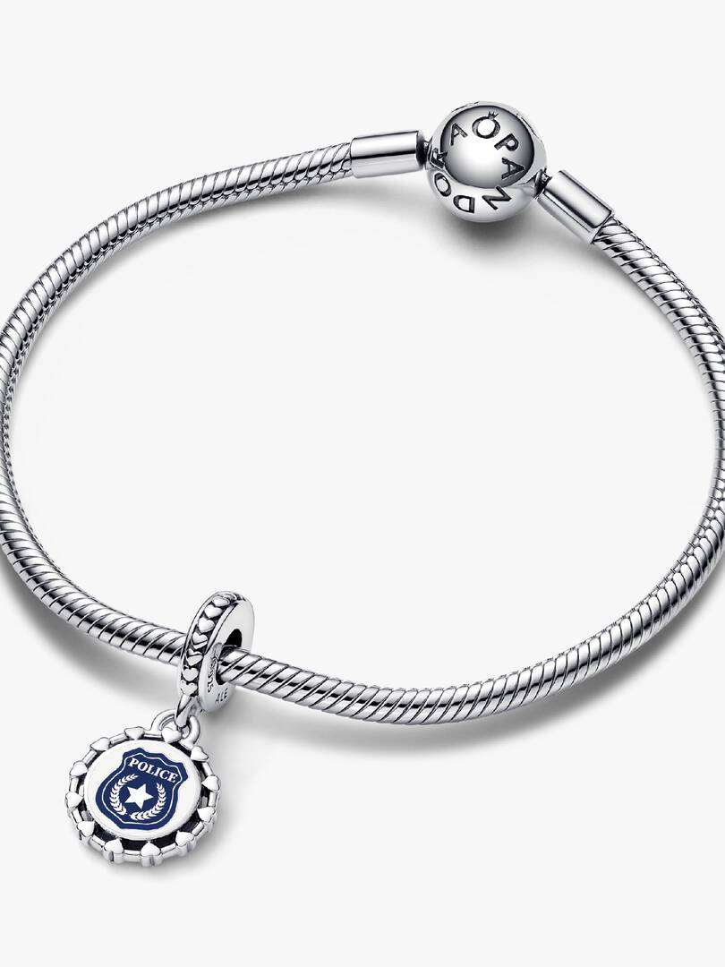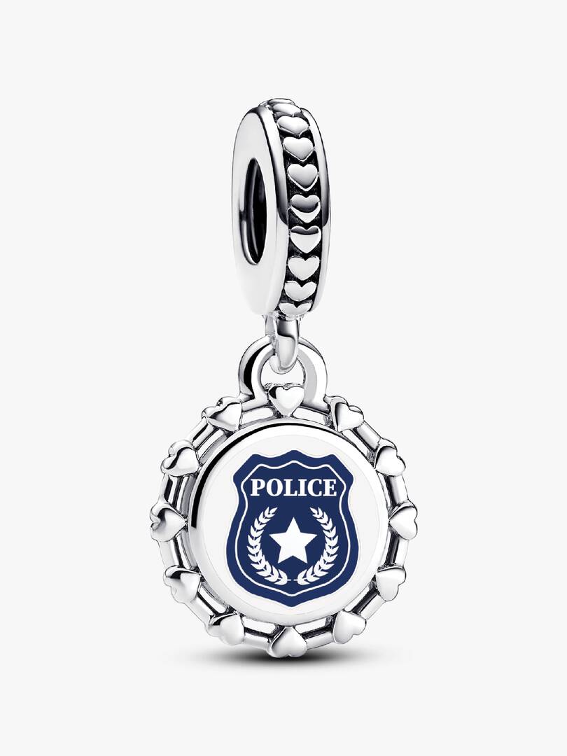 Honor the courage and sacrifice of law enforcement with this Engravable Police Dangle Charm in sterling silver. Featuring a row of hearts and a detailed blue police badge, it symbolizes bravery and service. Add a custom ,engraving on the back to make this meaningful charm uniquely yours??a perfect tribute to those who protect and serve.