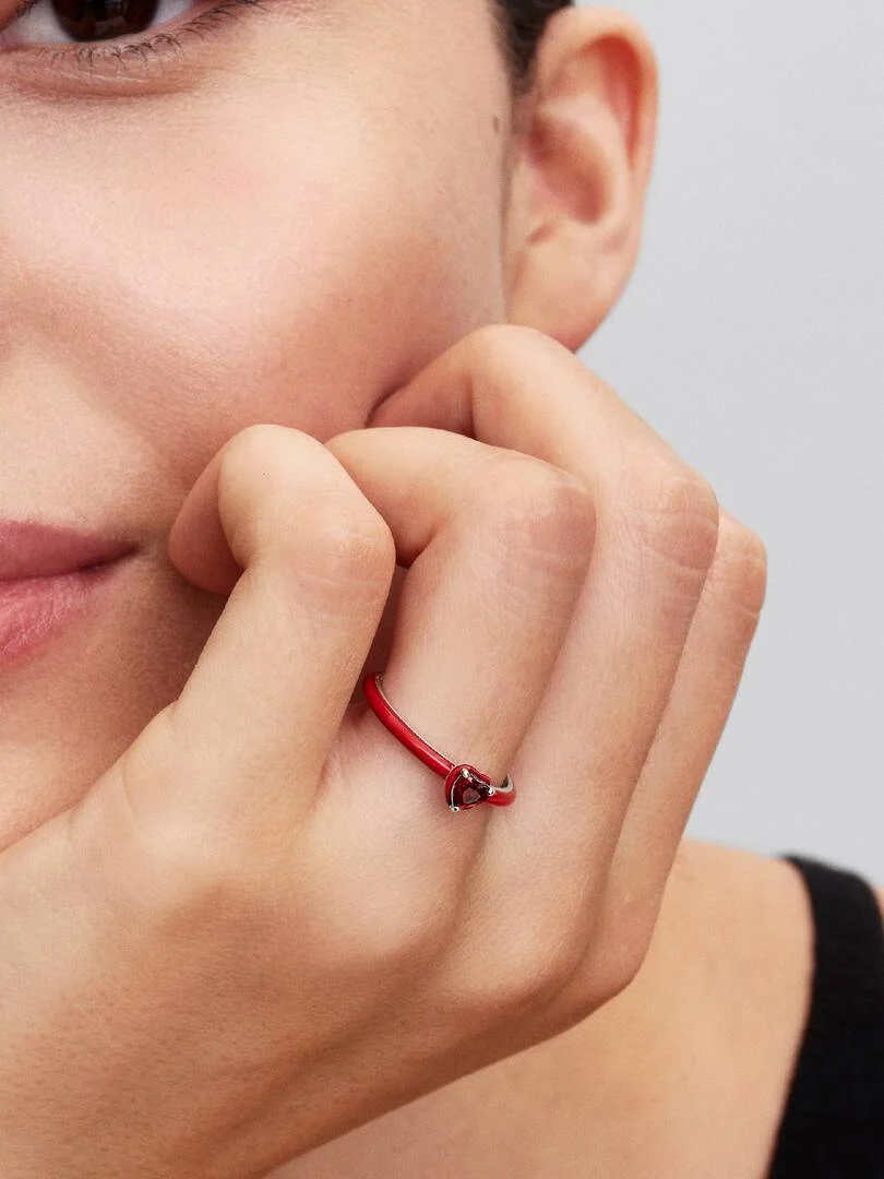 Crafted in sterling silver, this ring features a red heart-shaped stone accented by a halo and band of tonal enamel. A symbol of love for yourself and others.