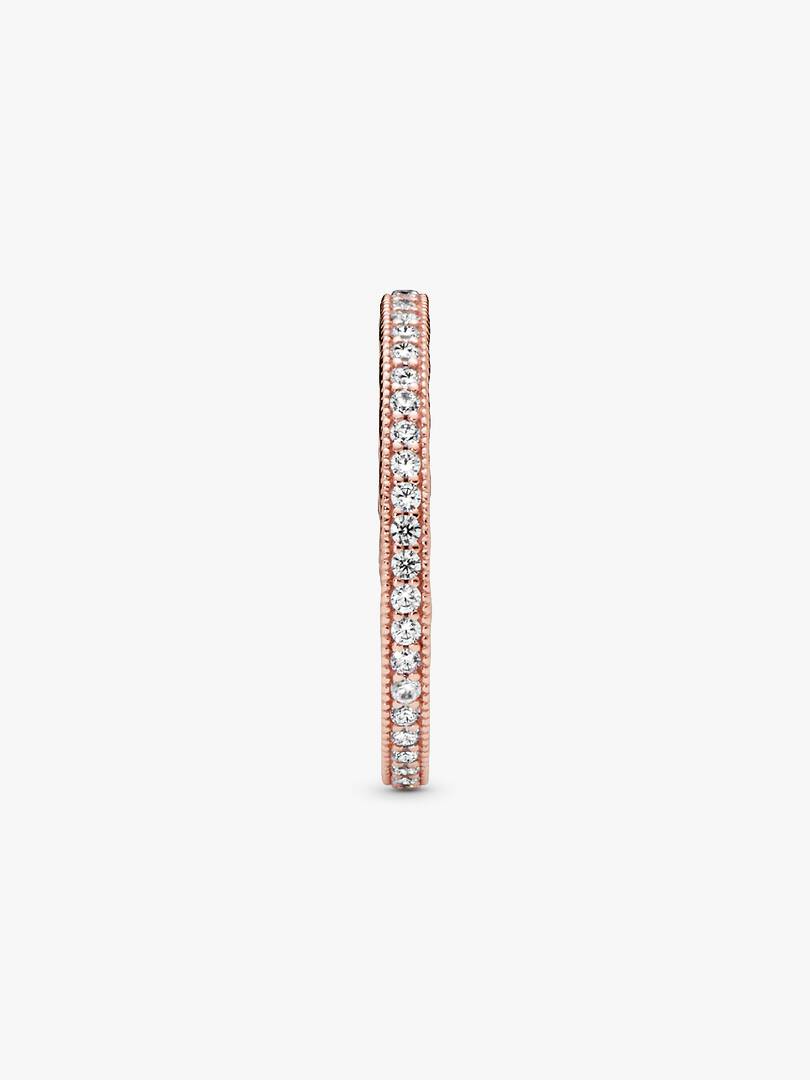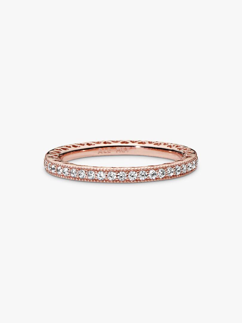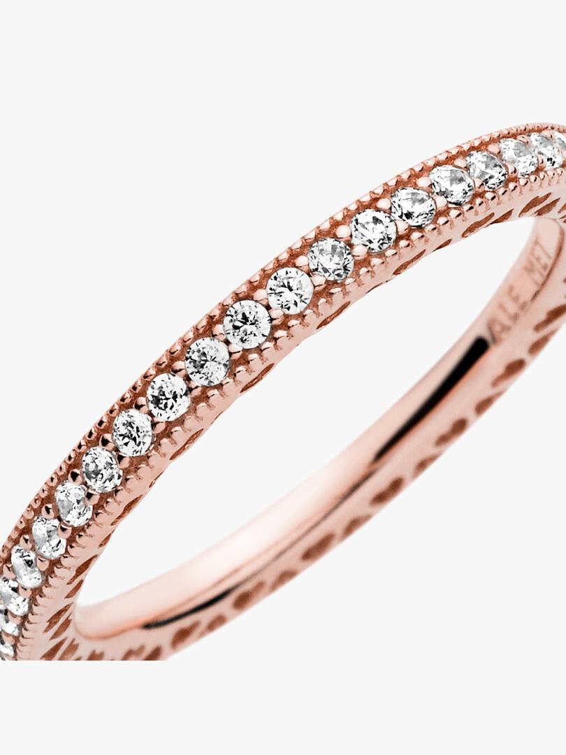 Express your heart’s true desire with this Sparkle & Hearts Ring. Hand-finished in 14k rose gold plating, this elegant style beautifully combines dazzling cubic zirconia stones with delicate cut-out hearts. Showcase it o,n its own or mix and match with other Pandora stackable rings for a chic play on textures.
