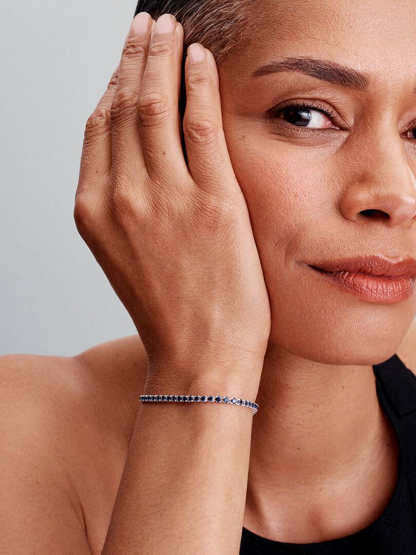 Our reimagined classic tennis bracelet is crafted from sterling silver and features a sparkling row of 34 prong-set round brilliant-cut royal blue man-made crystals. Designed with layering in mind, this is the ultimate p,iece to add scale and depth to your stacks with its larger stone size. Wear yours as a sparkling statement all season and beyond, or wrap it up as a glittering surprise for the one you love.