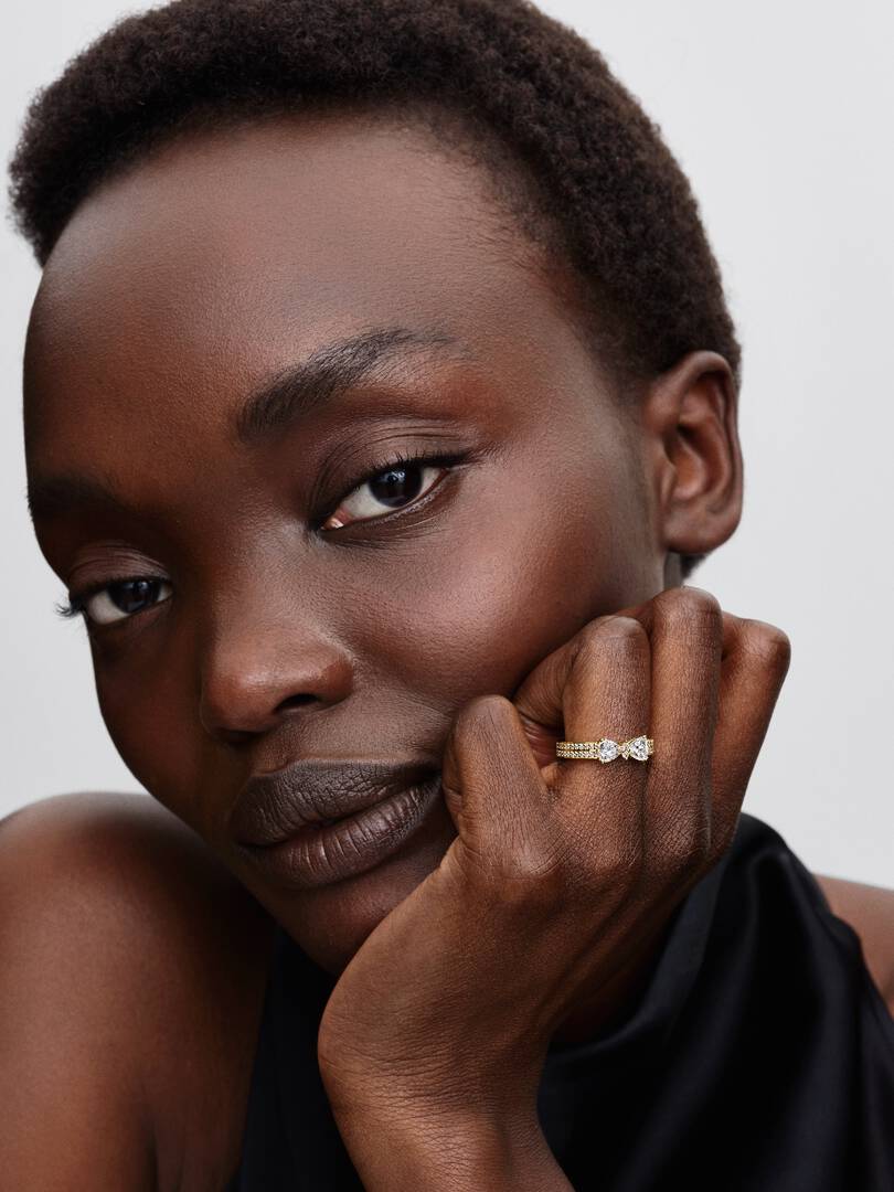 This eye-catching ring features a contemporary bow motif surrounded by cubic zirconia, accented by a double row of pav?? stones. Perfect for adding a touch of shine to any outfit.