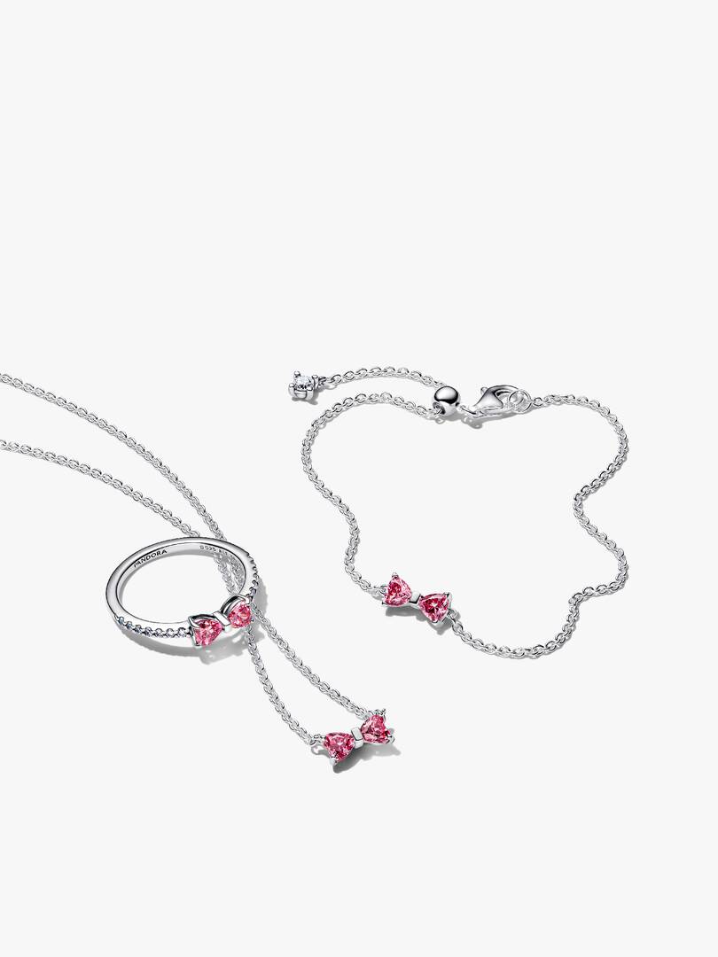 Tie your look together with a bow. Or several. This set includes a matching bracelet, ring, and necklace ?C each crafted from sterling silver and detailed with a sparkling pink bow.