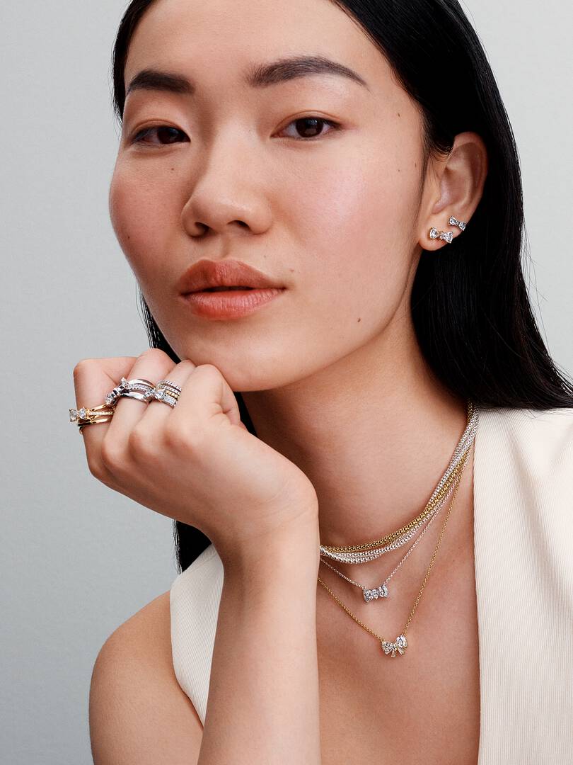 You’re never fully dressed without a bow. But this time, that bow is made up of sparkling cubic zirconia, set in a sterling silver bow-shaped centrepiece, fixed to an adjustable chain. The stones have been especially cut, to create a bow shape when arranged, ready to tie all your looks together. Wear this collier necklace for a touch of festive sparkle, or wrap it with love for the one who’s top of your gift list.