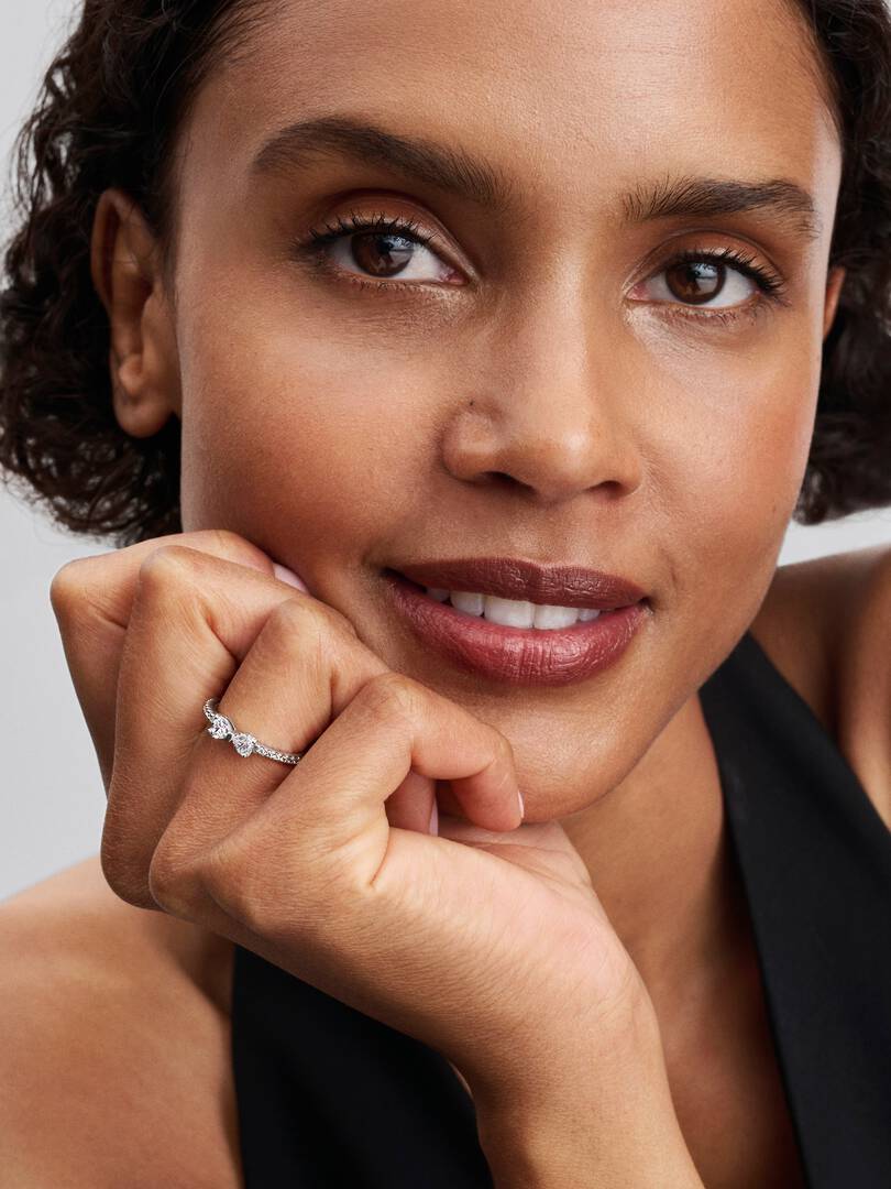 Embrace delicate design with the Sparkling Bow Ring. Two heart-shaped stones are set in the shape of a bow at the center of this sterling silver ring, which also features a row of pav?? on the top half of the band. A swee,t and feminine style, this bow-inspired ring is designed to be worn on its own for a minimalist look that speaks volumes.