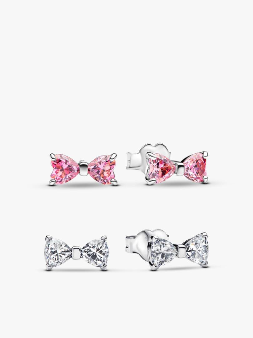 The Sparkling Bow Stud Earrings from Pandora feature delicate sterling silver bows adorned with cubic zirconia stones for a touch of elegance. The Sparkling Pink Bow Earrings add a soft pink hue, while the Sparkling Smal,l Bow Earrings offer a clear, versatile sparkle??both perfect for adding playful refinement to any look. These earrings are also ideal for stacking, allowing you to mix and match for a personalized and stylish ear party.