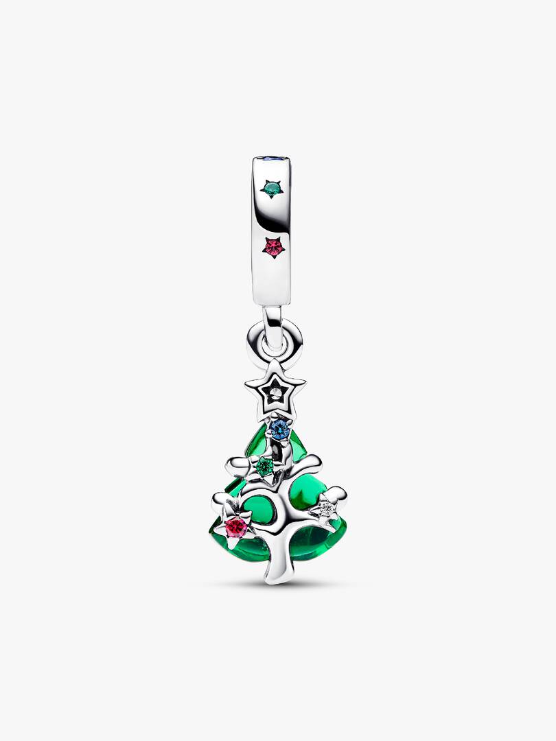 Shine bright this season with the Sparkling Christmas Tree Dangle Charm. Capture the true magic of the holiday season with this silver dangle charm that features a tree-shaped green man-made crystal dotted with shimmerin,g golden enamel to represent stars. On the other side, different colored man-made stones are set along the tree??s sterling silver branches. A twinkling, brightly colored Christmas charm brings the most festive of touches to your collection of Pandora Moments charms ?C and every holiday look you pair them with.