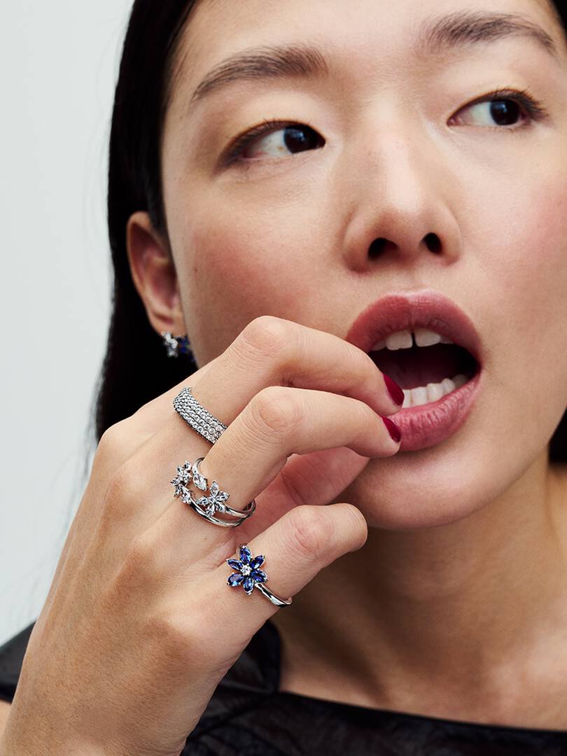 Sparkle in color with the Sparkling Herbarium Cluster Ring. Featuring man-made crystals in the shape of a flower, this sterling silver ring celebrates the beauty of nature. A cluster of alternating pear-shaped and marqui,se-shaped blue stones are set around a clear center stone, their various shapes evoking the natural symmetry found in the outdoors. Gift it to a nature lover in your life or wear it yourself alongside other Pandora herbarium-inspired styles for an eye-catching coordinated look.
