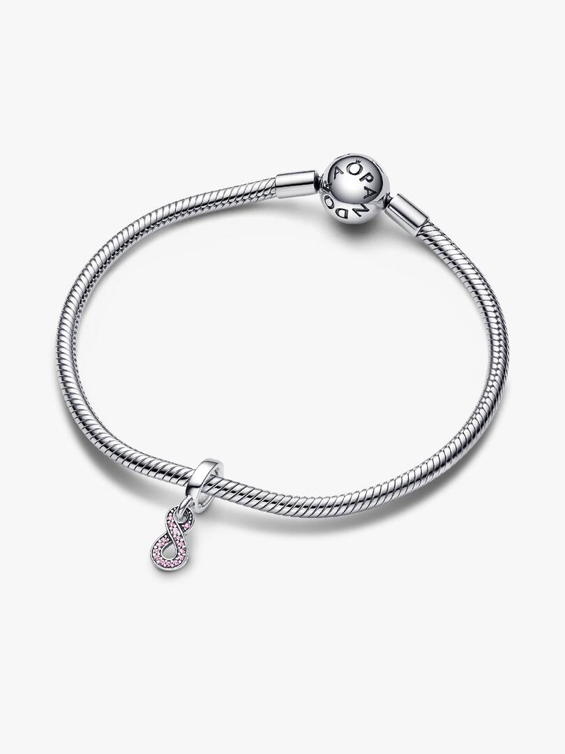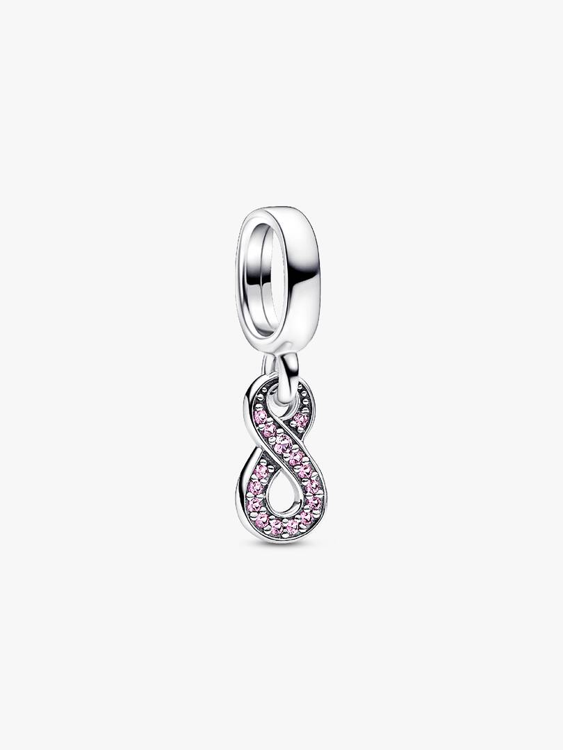 Show your love spans to infinity and beyond with the Sparkling Infinity Dangle Charm. The ultimate symbol of everlasting connection, the infinity symbol has been reimagined in a slightly asymmetrical shape featuring pink, sparkle on its front side. Attached to the bail at the top with its smaller loop, this infinity charm features a heart shape cut-out on the back where its parts overlap. Gift it to a friend of a family member to let them know your bond will last forever and beyond