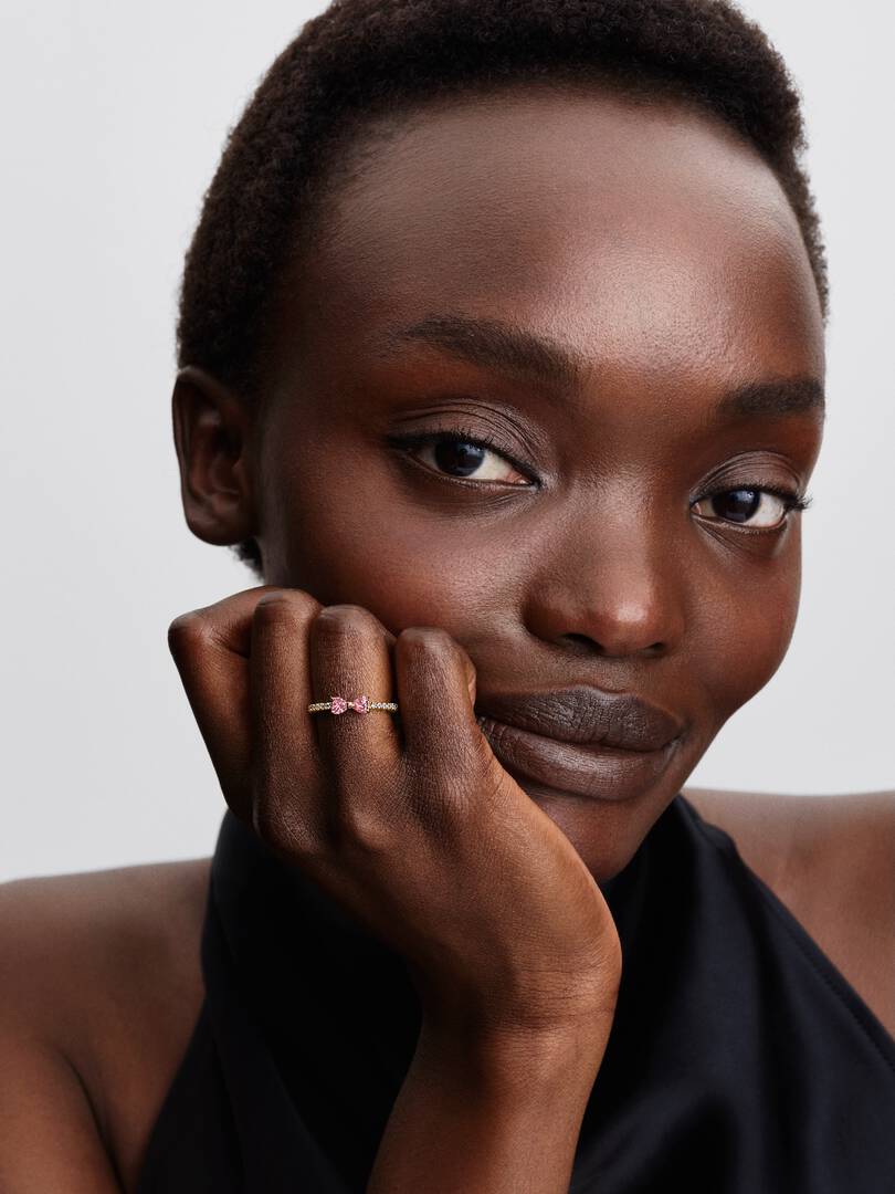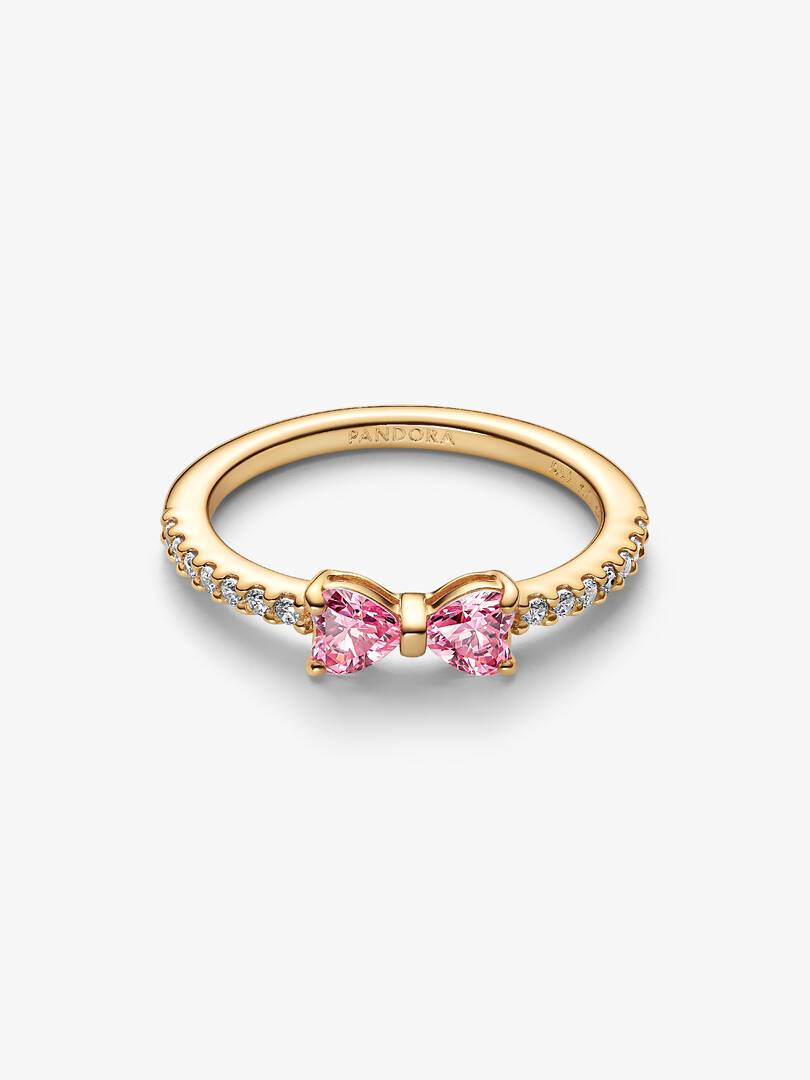 Shine bright this festive season with a new icon of celebration??a 14k gold-plated, Sparkling Pink Bow Ring. Featuring heart-cut pink stones and a pav??-set band, it shifts with the light and makes every movement shine.