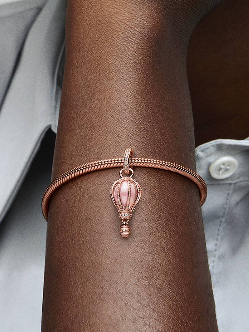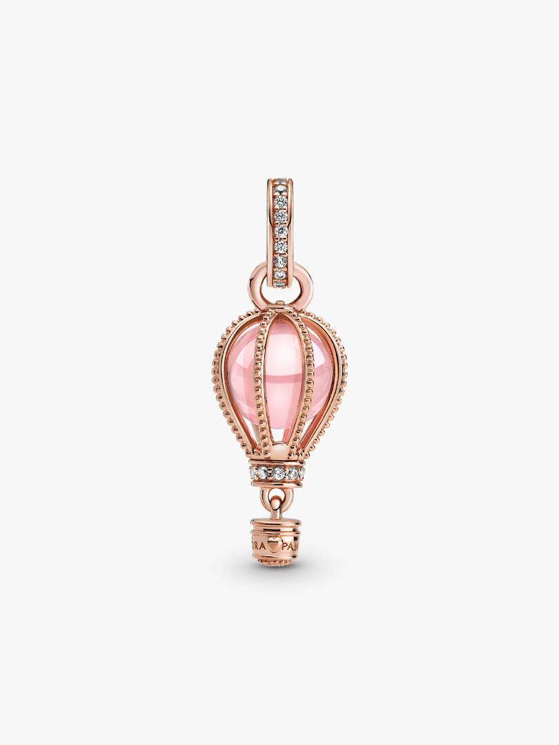 Reach new heights with the Sparkling Pink Hot Air Balloon Dangle Charm. This warm-toned charm is hand-finished in 14k rose gold plating. Beaded ropes encase a fairy tale pink crystal accented by shimmering clear cubic zi,rconia. The bail and base of the balloon are embellished with glittering pav??. Below, a small gondola awaits to transport you to your destination. Wear it for daily inspiration or gift it to someone who is ready for their next adventure.