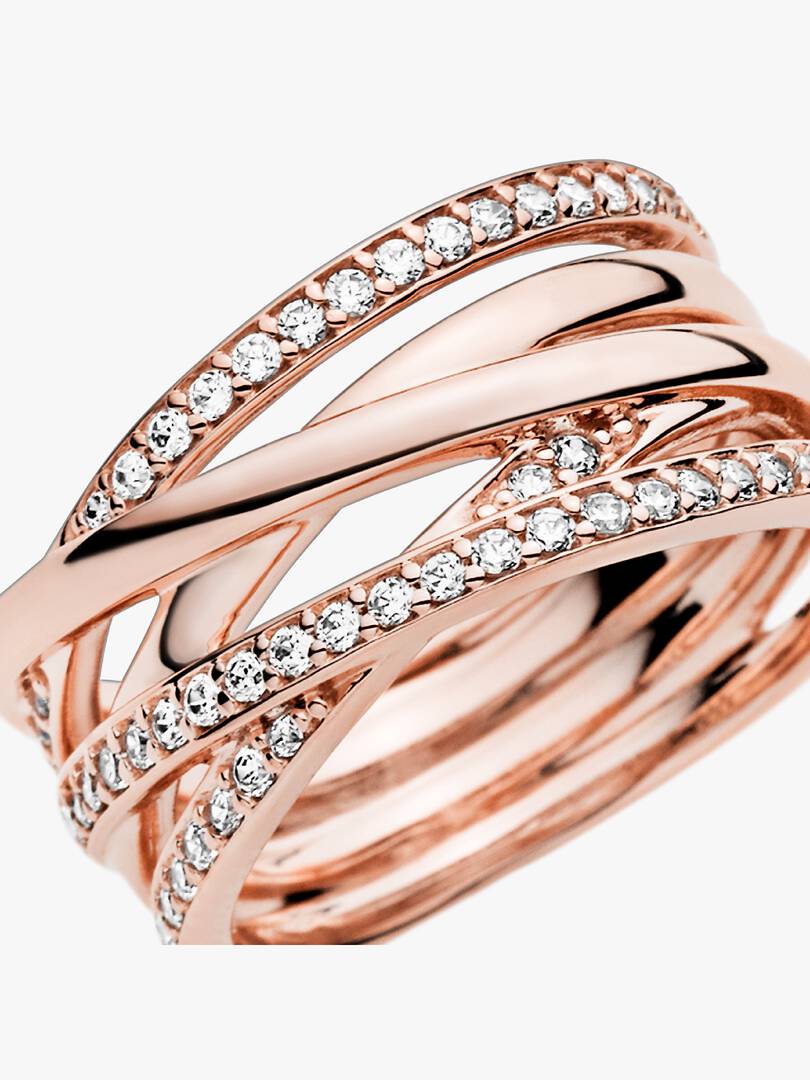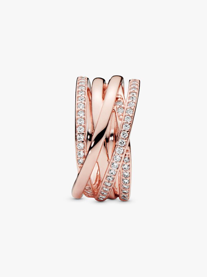 Let your individuality shine with this Sparkling & Polished Lines Ring. In a 14k rose gold-plated finish, this sophisticated and contemporary design entwines rows of polished metal with rows of shimmering cubic zirconia ,stones. This statement style can be worn on its own as a chic cocktail ring or together with other Pandora rings.