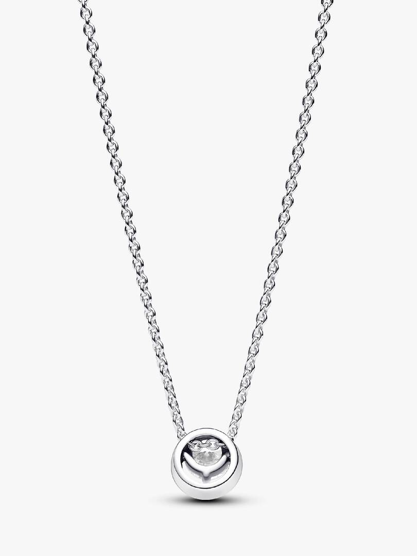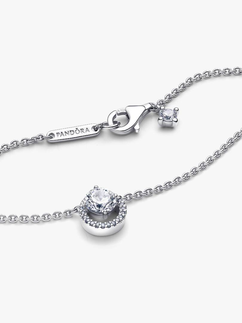 Channelling timeless elegance, the sterling silver Sparkling Round Halo Pendant Collier Necklace, adorned with clear cubic zirconia, represents the enduring beauty of circles. The pendant features an off-center, prong-se,t round stone that delicately overlaps a pav?? halo, allowing it to slide freely along the adjustable 38 cm, 42 cm, or 45 cm cable chain. With an engraved Pandora logo and a dangling stone by the lobster clasp, this necklace adds sophistication to any look. A perfect gift for those who appreciate classic beauty and elegance.