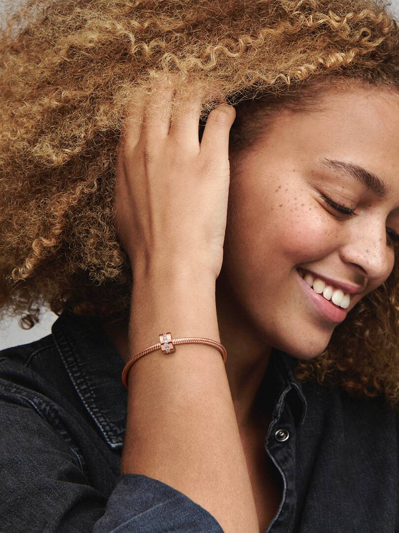 Light up your Pandora charm bracelet with this sparkling spacer charm. This sophisticated, 14k rose gold-plated piece is accented with a decorative line of shimmering cubic zirconia stones. Designed with a hidden silicon,e grip, this stunning Pandora spacer will keep your charms perfectly positioned while adding a touch of sparkle. This clip charm features no silicone grip, so it will slide if not styled onto threads (two raised charm dividers).