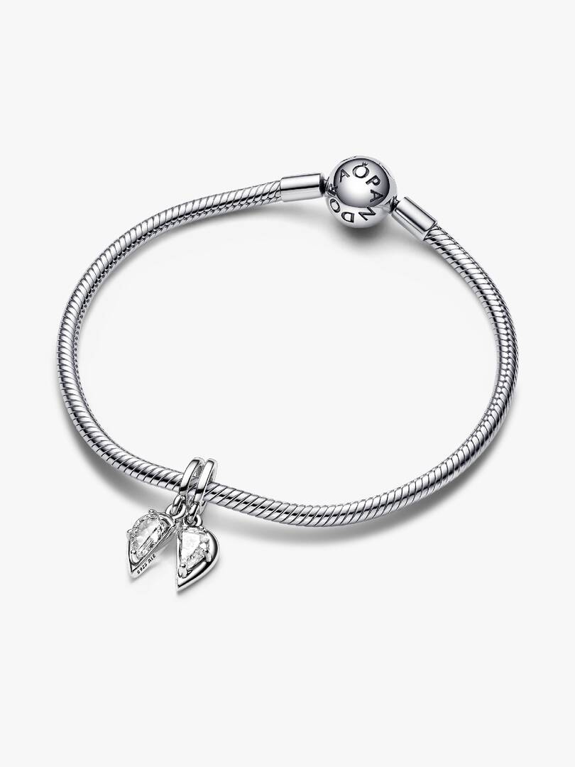A meaningful charm to symbolize the unbreakable bond between mother and daughter. The Splittable Mother & Daughter Dangle Charm consists of two sterling silver dangle charms that fit together to create a heart shape in t,wo halves, with a clear cubic zirconia stone at the center and a cut-out heart on the reverse side. One half of the charm is engraved with the word “MOTHER” and the other half with “DAUGHTER”, so you can each wear one half as a reminder that the love you share is always there, even when you’re apart – because you’ll always have a piece of each other’s heart.