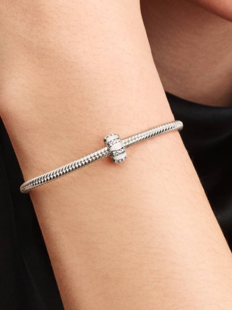 Your look will shine with the cool-toned Stones & Enamel Clip Charm. This sterling silver charm features alternating rows of sparkling stones and shimmering white enamel, which contrast intriguingly with the charm’s base,, which also has a silicone grip inside the clip. The charm’s design was inspired by motifs of resilience and beauty ?Csymbolizing the many possibilities you hold within you, much like the possibilities held within one small yet elegant and thoughtfully-made piece.