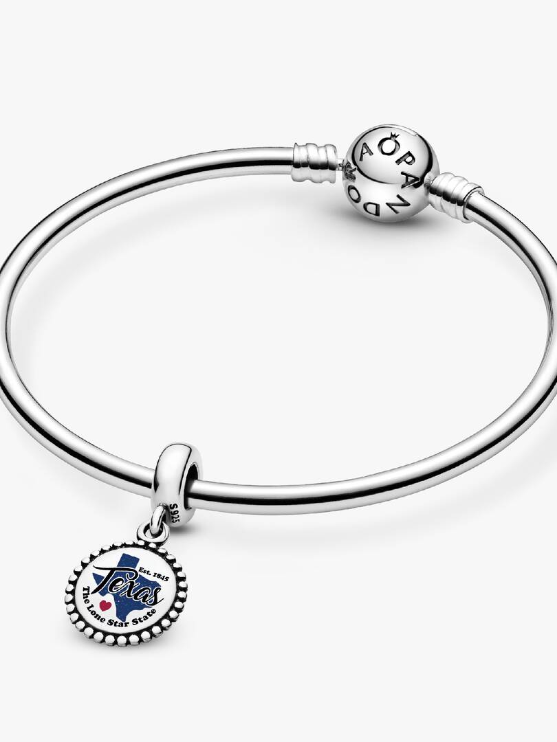 Add a piece of the Lone Star State to your style with this sterling silver dangle charm. Featuring a state-shaped silhouette in glossy blue enamel, a small red heart underneath, and ??Texas?? beautifully scripted across in, large lettering??because everything??s bigger in Texas!