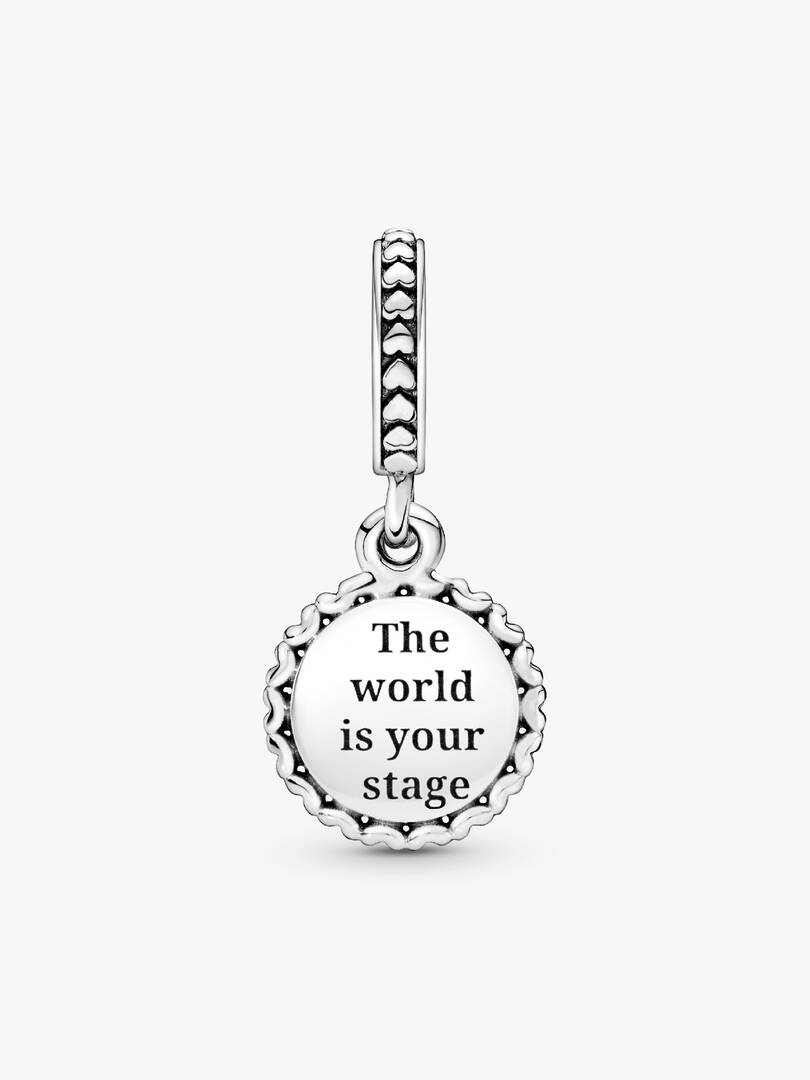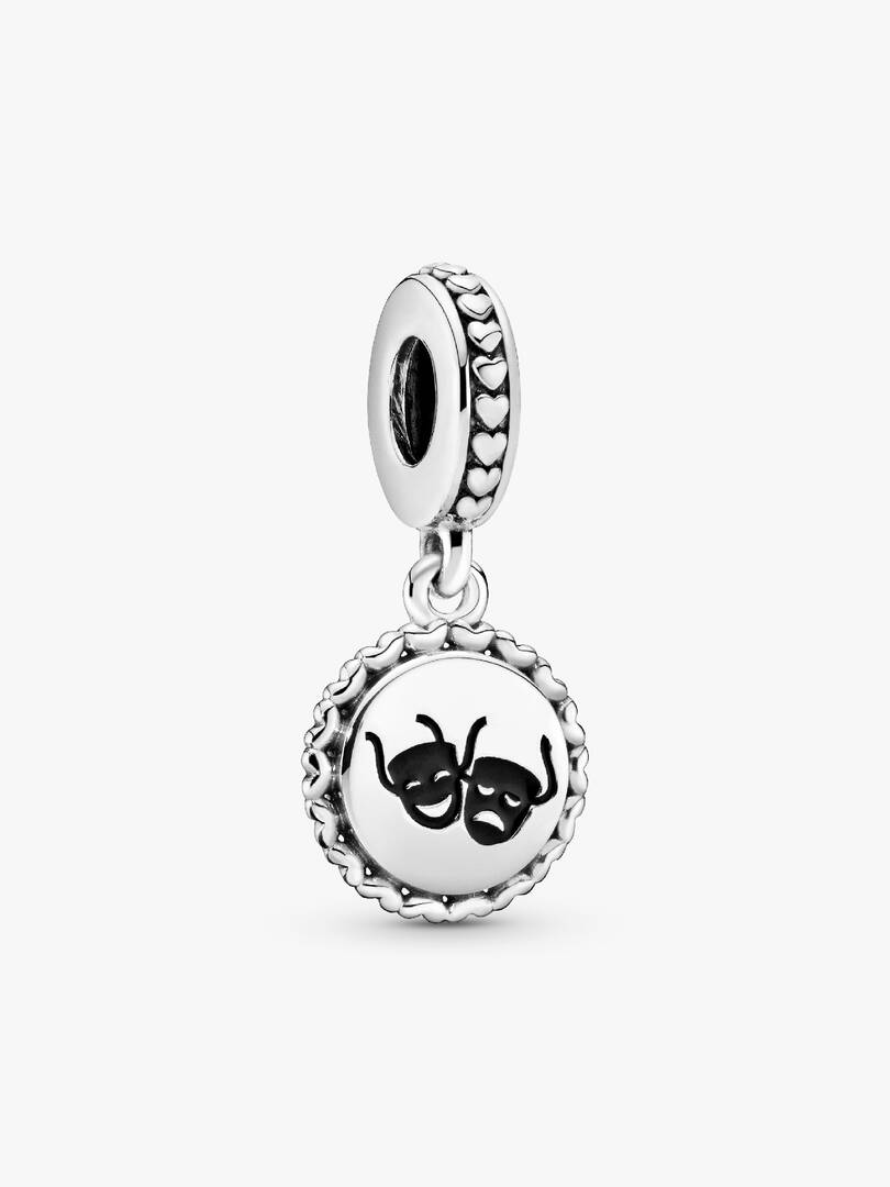 Get dramatic with the Theatre Masks Dangle Charm. Featuring two theatre masks in hand-applied black enamel on the front and the message “The world is your stage” engraved on the back, this charm is a true tribute to thea,tre. Inspired by the comedy and tragedy masks worn in ancient Greek theatre, they’re a universal symbol for theatrical performances. This round dangling disc charm, with a row of delicate 3D hearts on the border, adds dramatic flair to any look.