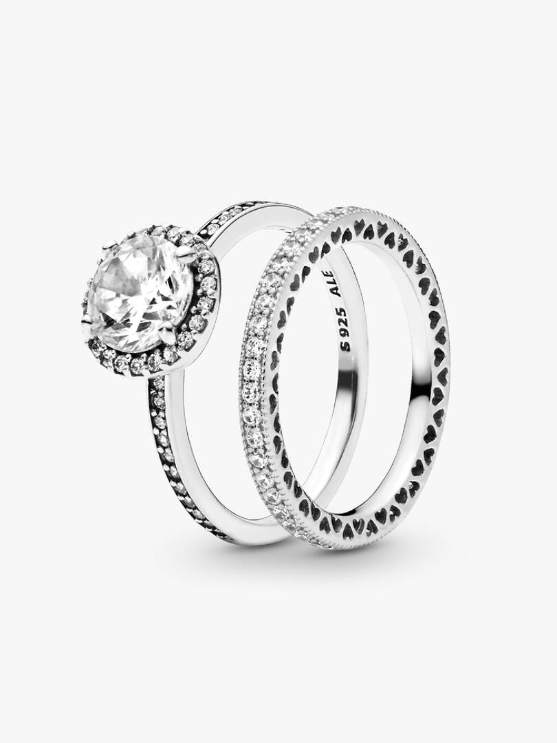 Timeless glamour meets dazzling elegance in this vintage-inspired ring set. Stun with sophistication with the Round Sparkle Halo Ring featuring a large brilliant-cut cubic zirconia surrounded by tiny shimmering stones. C,ouple it with the delicately textured Sparkle and Hearts Ring to add opulence to your favorite outfit.