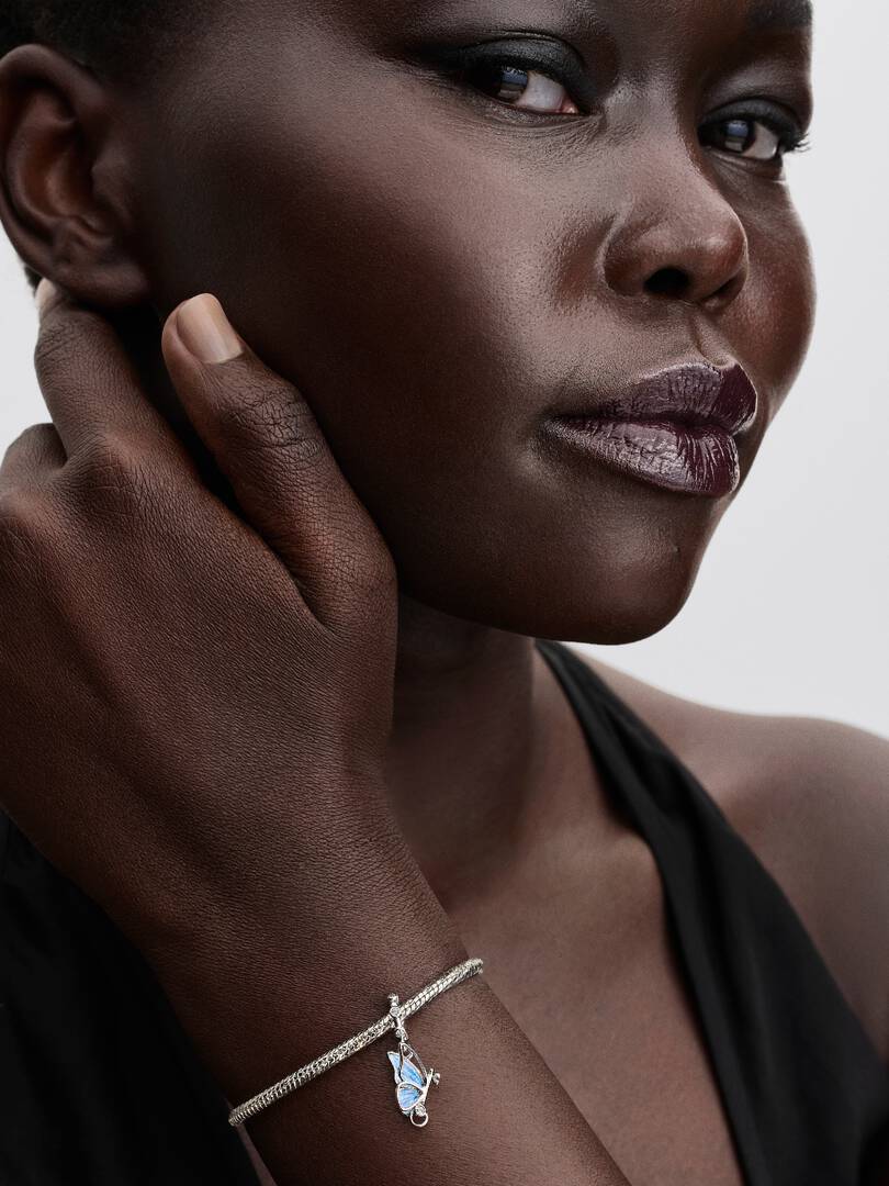 Unlock your dreams with our sterling silver Winged Dangle Charm. The butterfly??s head and body form a key. One wing has an openwork design, while the other features shimmering enamel and the engraved message ‘UNLOCK TOMO,RROW’.